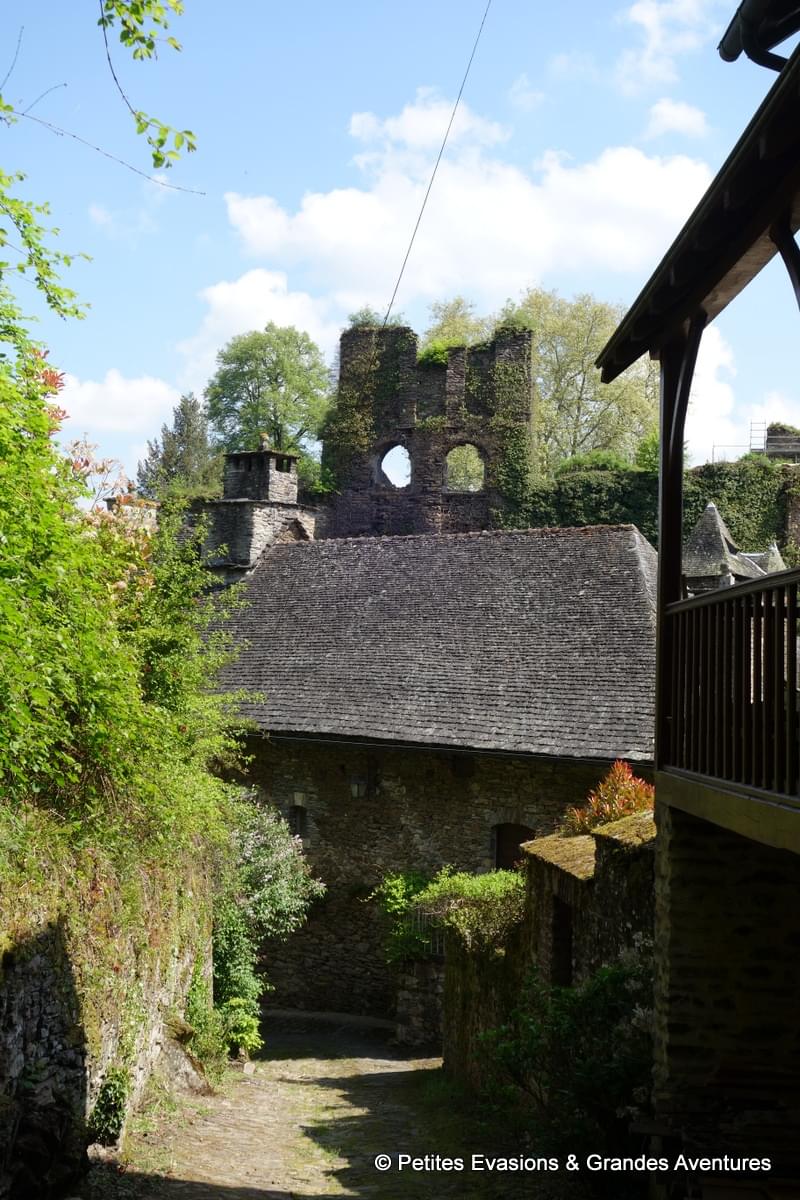 Sur le chemin au retour, au niveau la Place des Claux, une voie étroite et toute en galets qui disparaissait derrière les maisons Boyer et Henri IV a attisé notre curiosité. Dans cette petite ruelle aux allures médiévales, nous avons fait un nouveau saut dans le temps et profité d’une jolie vue sur les vestiges du Château ainsi que sur les toits de Ségur.