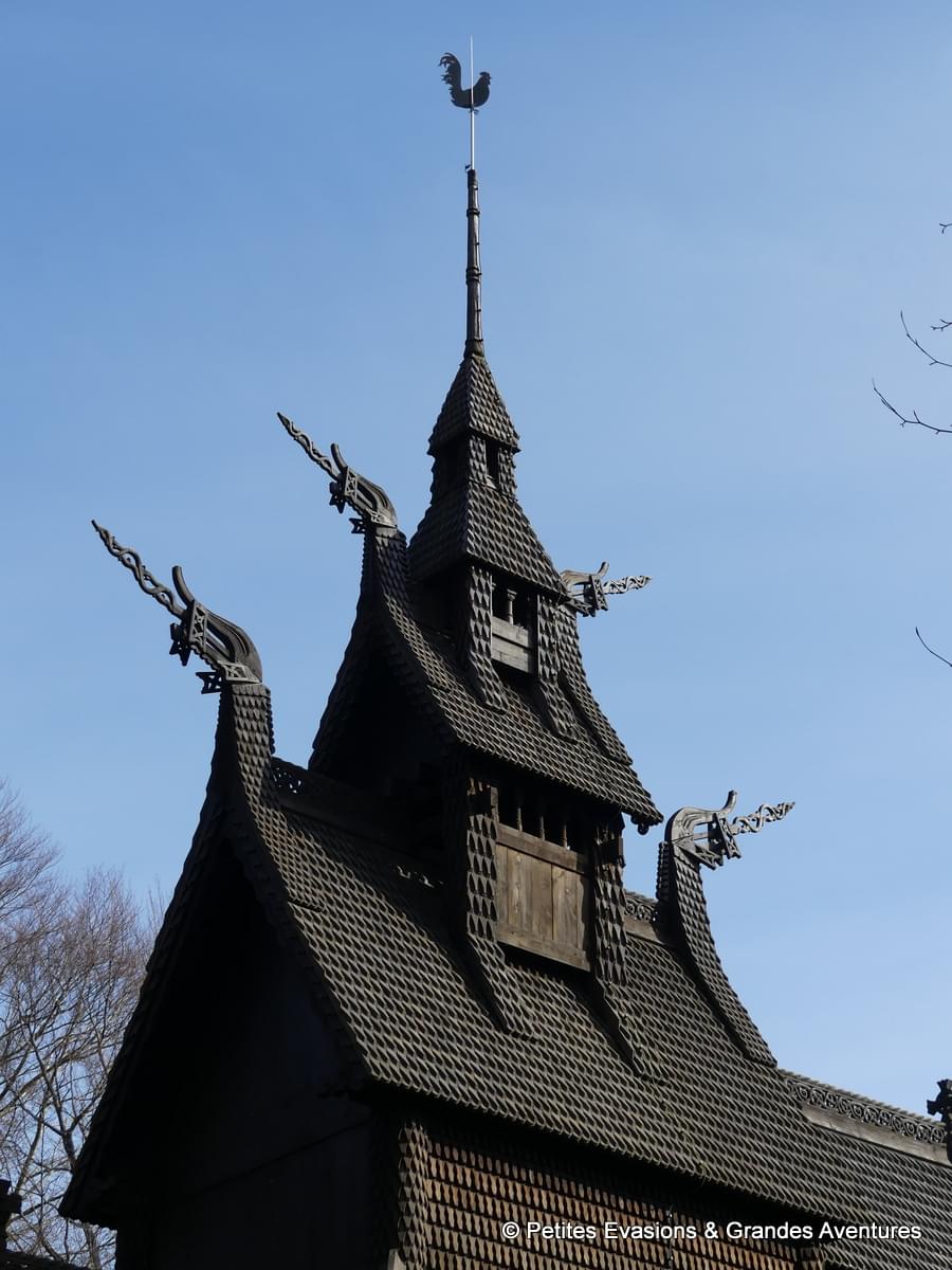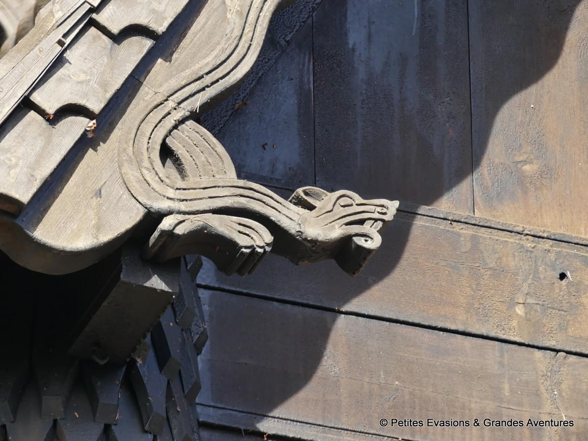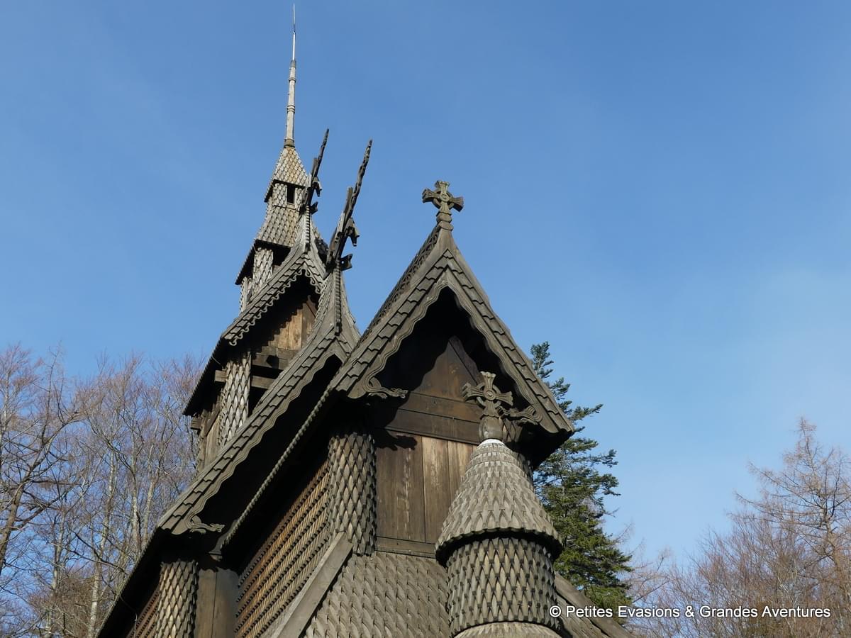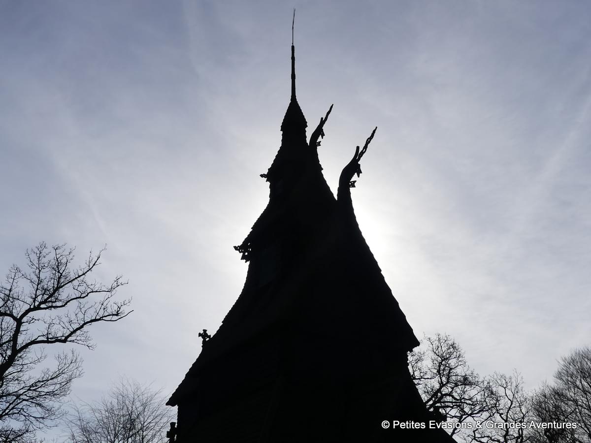 Et, au détour d’un virage, découvrir le toit de la stavkirke, fruit d’un travail minutieux du façonnage du bois. C’était la deuxième stavkirke que nous voyions, après avoir contemplé la Gol Stavkirke, au Norsk Folkemuseum à Bygdøy, mais la fascination pour cette architecture proche de l’orfèvrerie était intacte.