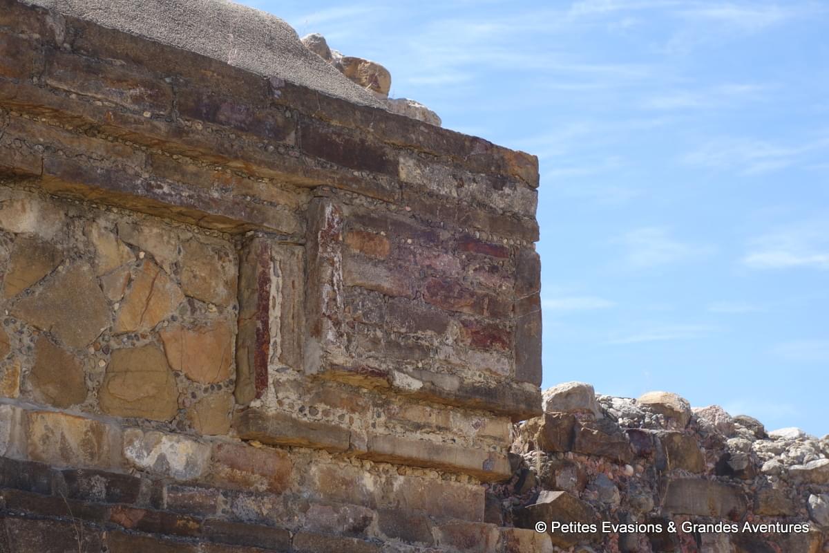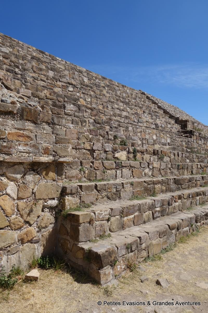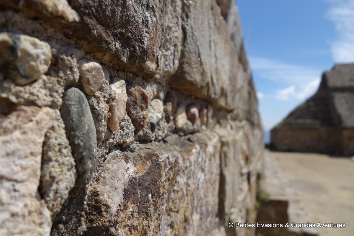 Depuis certains points de la plate-forme nord, on a pu profiter d’une vue panoramique sur le site et se rendre compte de sa surface mais aussi de la rigueur qui caractérise sa construction. A Monte Albán, tout semble rectiligne, étudié, mesuré pour créer un ensemble harmonieux et ordonné. Et comme souvent sur ce genre de site, bâti à une époque où nos outils modernes et technologiques n’existaient pas, j’ai été émerveillée de voir la précision des constructions et l’état de conservation du lieu.