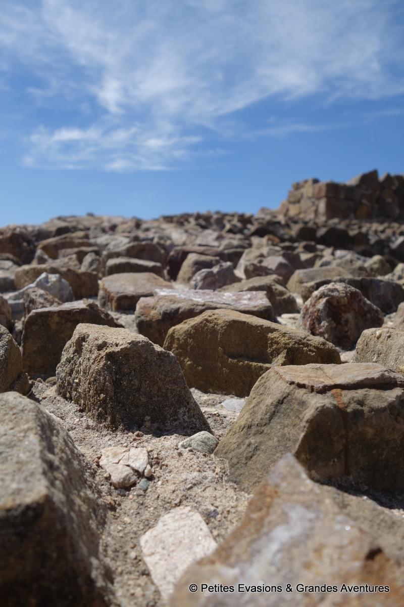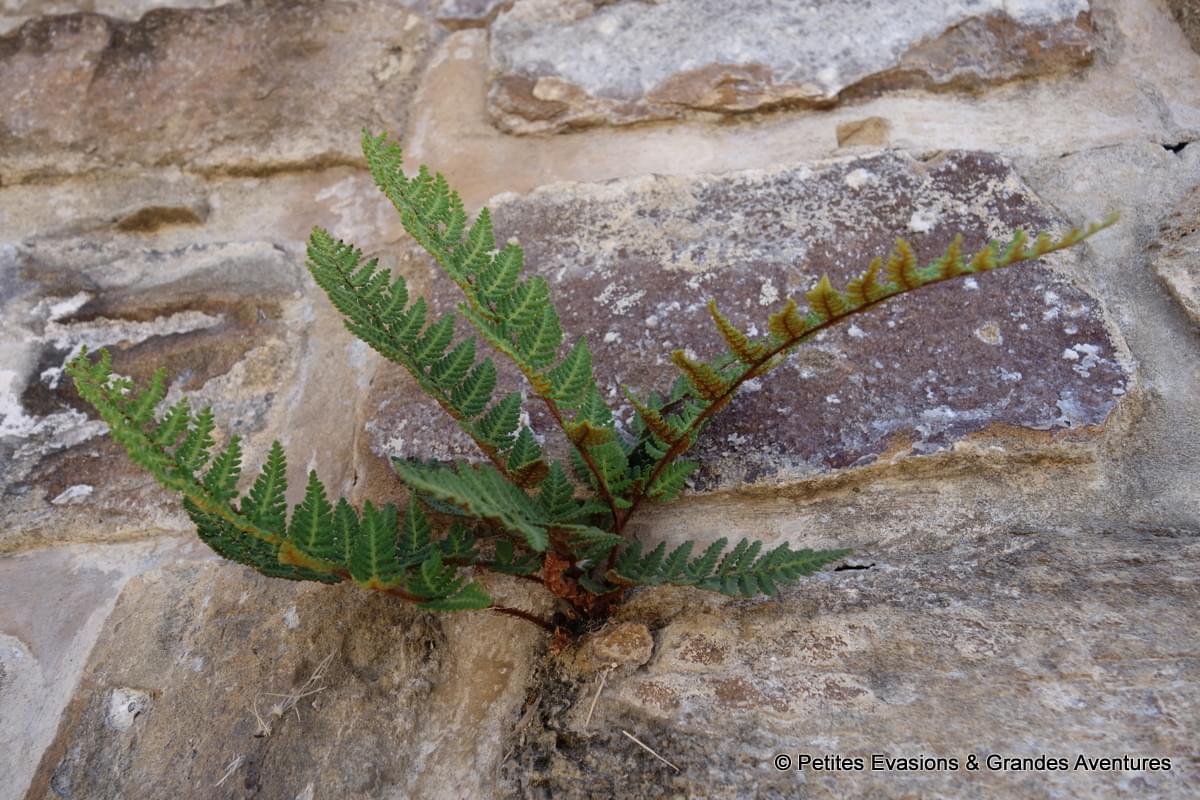 Cette plate-forme est significativement moins étendue que celle du nord, moins complexe aussi. De chaque côté de l’escalier monumental (et raide !) qui permet d’accéder à son sommet, la végétation recouvre entièrement les versants et les pierres. Ce côté végétalisé donne, à mon sens, un côté pas totalement exploré à cette partie du site, comme si tous les secrets n’en avaient pas encore été révélés.