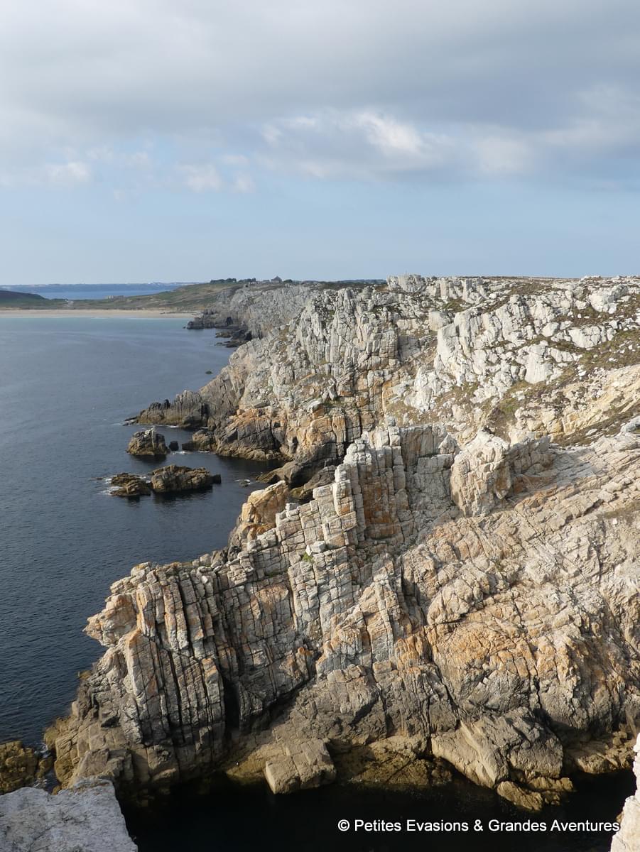 Situé au nord du Cap de la Chèvre, à l’ouest de Crozon, la Pointe de Dinan offre elle aussi un lieu de promenade et des panoramas remarquables. Une fois garés sur le parking, prenez la direction de l’ouest et profitez d’une vue impressionnante sur le sud de la presqu’île, en toile de fond, et la plage fossile de Porzh Koubou (aussi appelée « plage de fer »), au premier plan. Continuez vers l’ouest pour admirer la Pointe de Dinan et ses roches morcelées, travaillées et taillées par l’eau et les éléments. Puis, un peu plus loin vers le nord, vous pourrez contempler le Château de Dinan, forteresse naturelle toute en rochers reliée à la terre par une arche, creusée par la mer. Superbe non ?