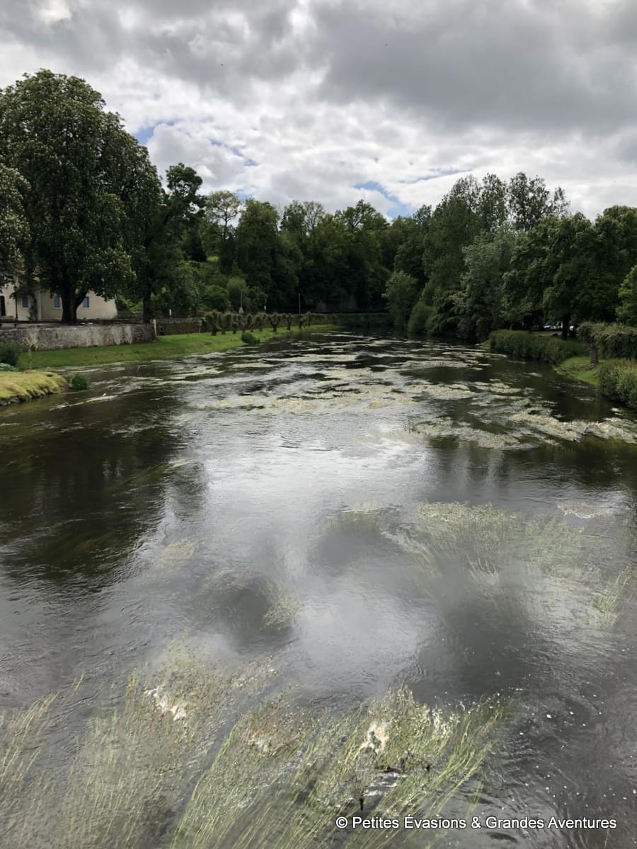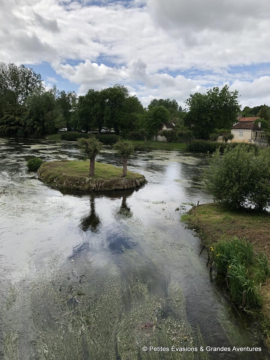 Juste à côté débute le pont qui permet de traverser la Dronne. Construit au 14e siècle, cet ouvrage à avant-becs a été détruit par des crues en 1735 puis reconstruit. Il est inscrit au titre des Monuments Historiques depuis 1987. Alors qu’on le traverse, impossible de ne pas tomber amoureux de l’adorable moulin, partiellement recouvert de vigne vierge, qui vivait autrefois au rythme de la Dronne.
