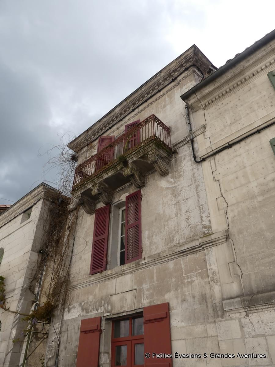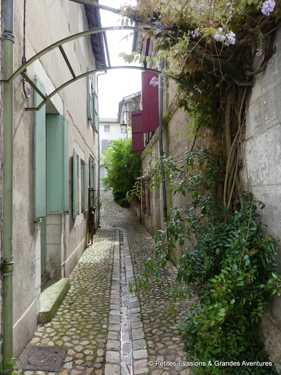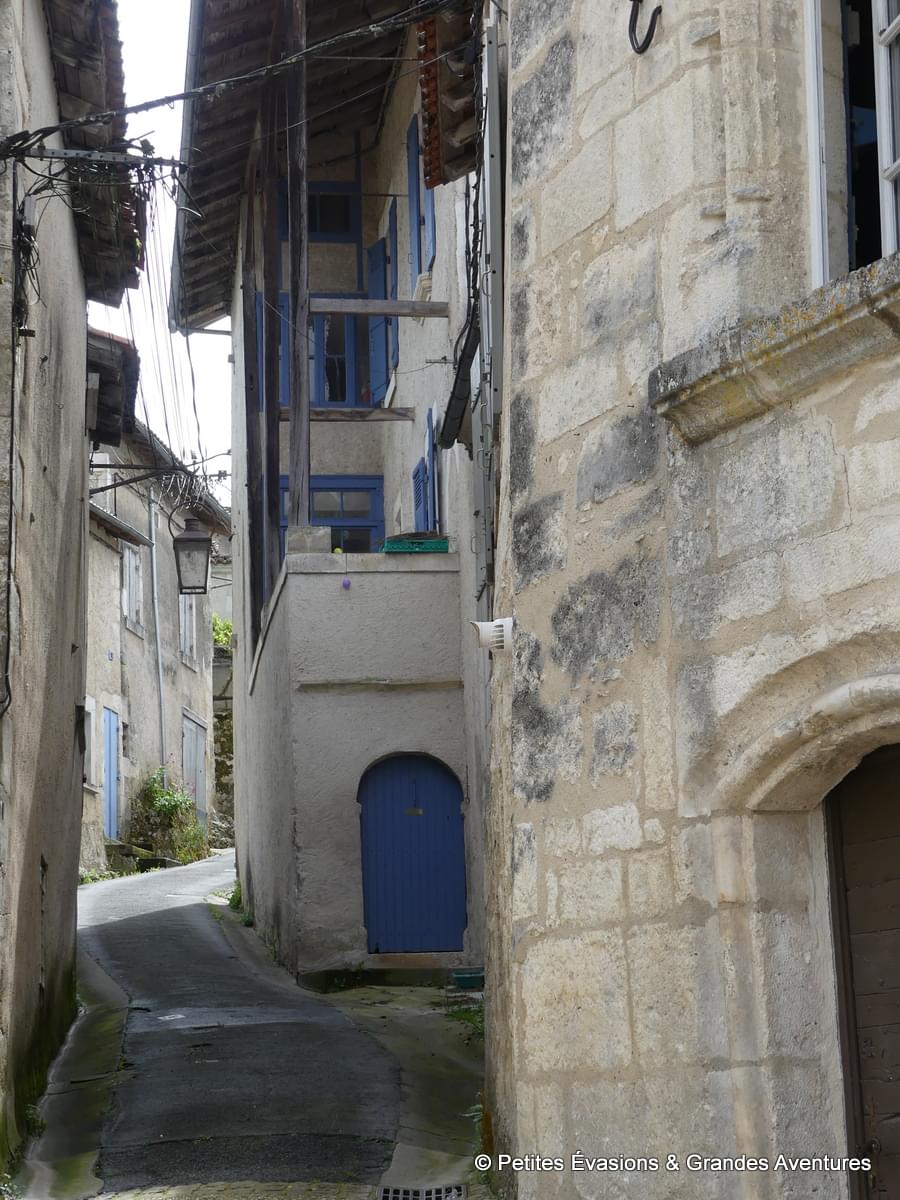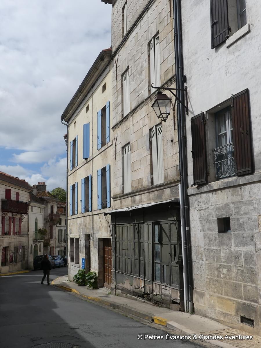 Garés à quelques mètres du Faubourg Notre Dame, on ne met pas longtemps à le rejoindre et à tomber sous son charme. De part et d’autre, on découvre des bâtisses aux pierres claires taillées avec soin et minutie, surmontées de toits rouges et agrémentées de menuiseries colorées. Toutes les nuances de l’arc-en-ciel se trouvent sur les volets et portes de Bourdeilles, rendant chaque maison unique.