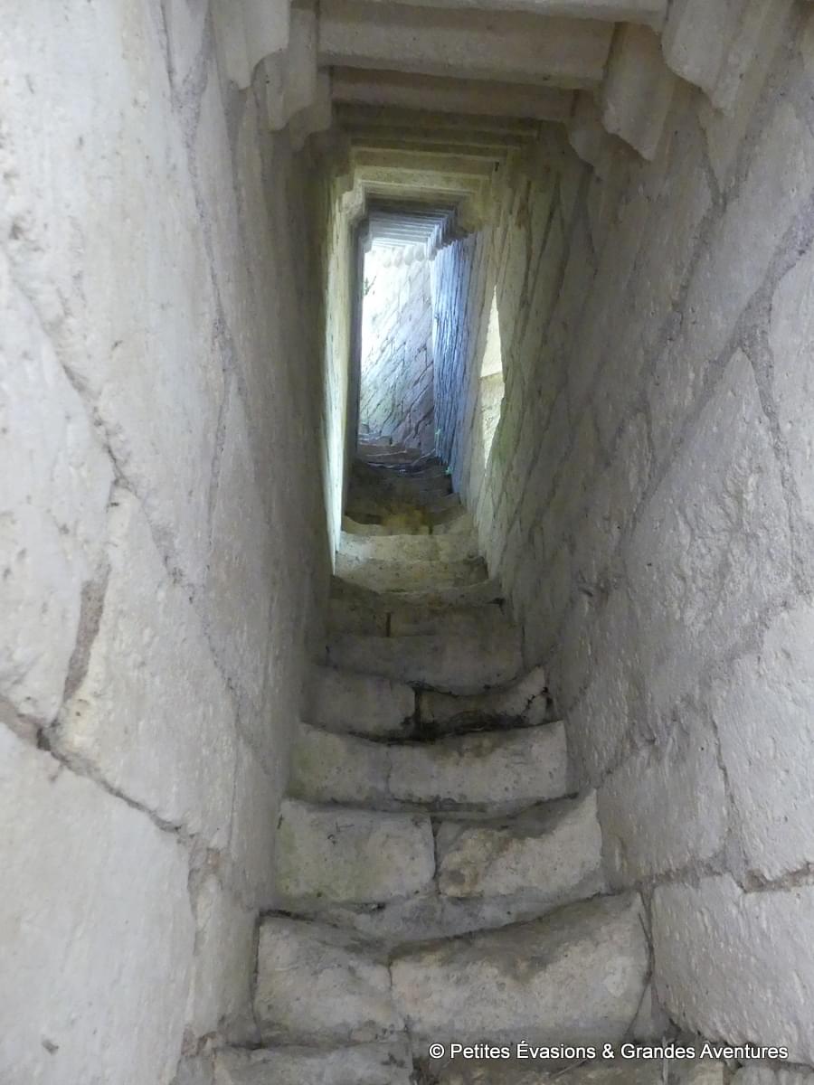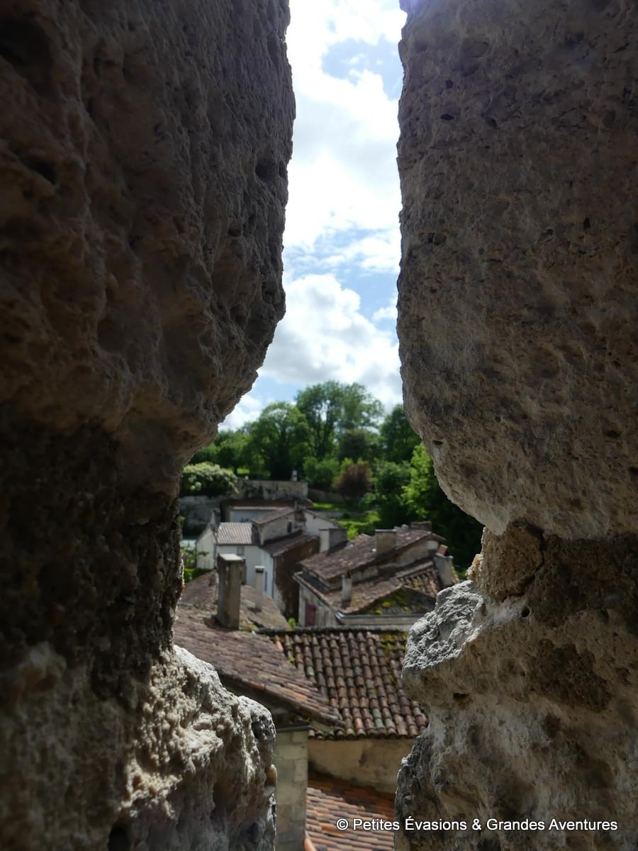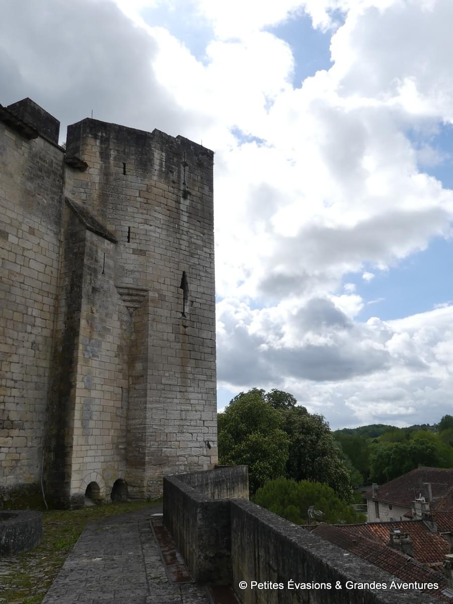 Une fois revenus tout en bas du donjon, on profite une dernière fois de la cour toute en pierres avant de poursuivre la visite. Depuis la « terrasse » qui occupe la partie la plus à l’ouest de l’éperon rocheux, on observe encore le village, la Dronne et le moulin. Cette maison sur l’eau et qui semble hors du temps est tout aussi belle et enserrée par la nature de ce côté-là.