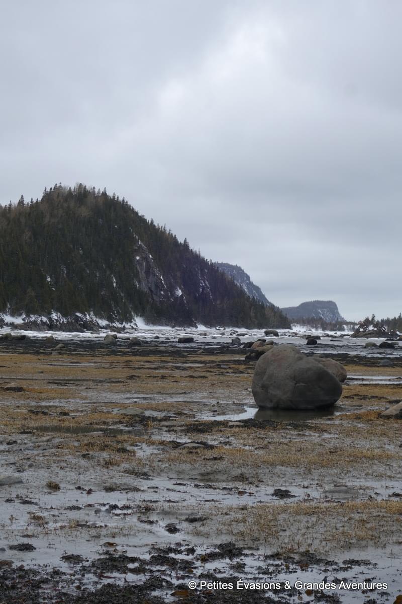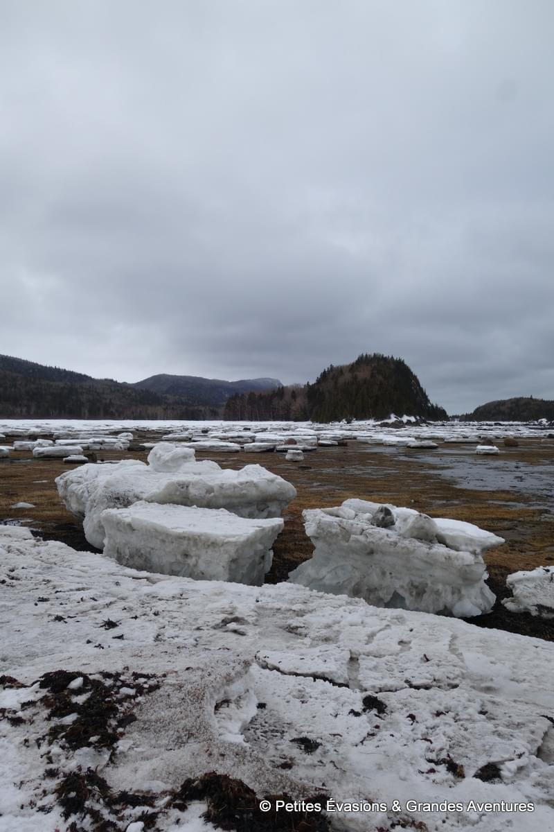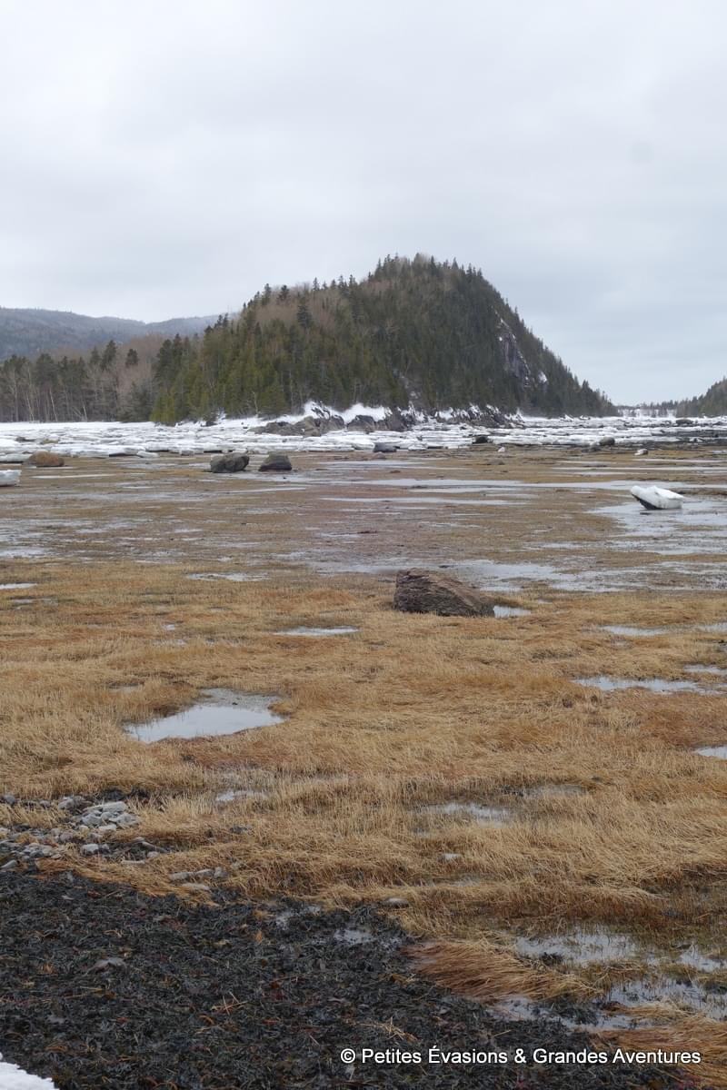 Lors de notre arrivée au niveau du Marais Salé, les eaux de l'estuaire justement avait déserté la baie. A la place de l’eau, on a découvert un sol parsemé d’algues, d’autres végétaux et de … blocs de neige en partie glacée ! Et puis, en arrière-plan, le relief du Mont Chocolat, celui du Cap-à-l'Orignal, le Pic Champlain … Un fabuleux tableau naturel dont il était difficile de détacher le regard.