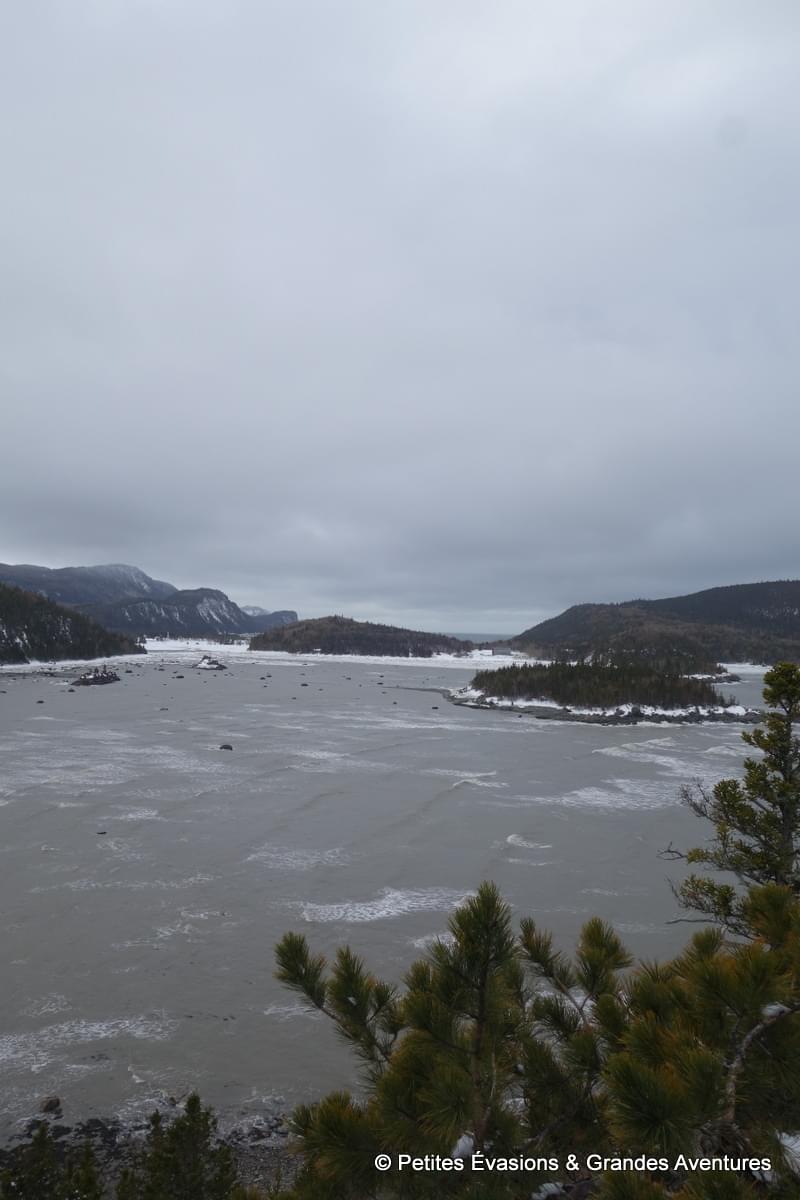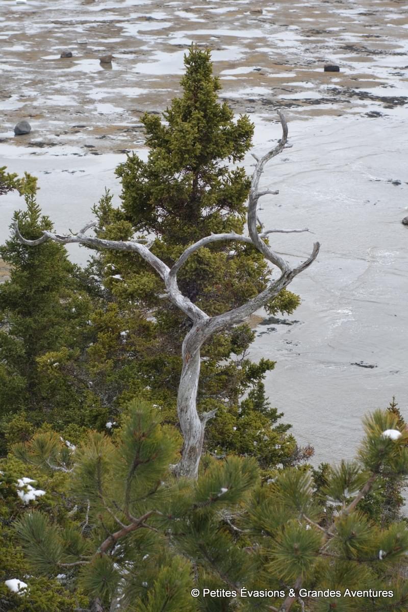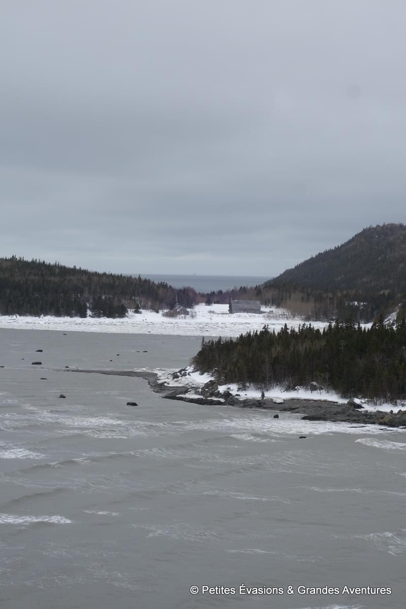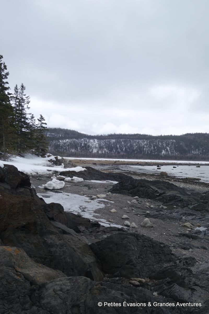 Lors de notre arrivée au niveau du Marais Salé, les eaux de l'estuaire justement avait déserté la baie. A la place de l’eau, on a découvert un sol parsemé d’algues, d’autres végétaux et de … blocs de neige en partie glacée ! Et puis, en arrière-plan, le relief du Mont Chocolat, celui du Cap-à-l'Orignal, le Pic Champlain … Un fabuleux tableau naturel dont il était difficile de détacher le regard.
