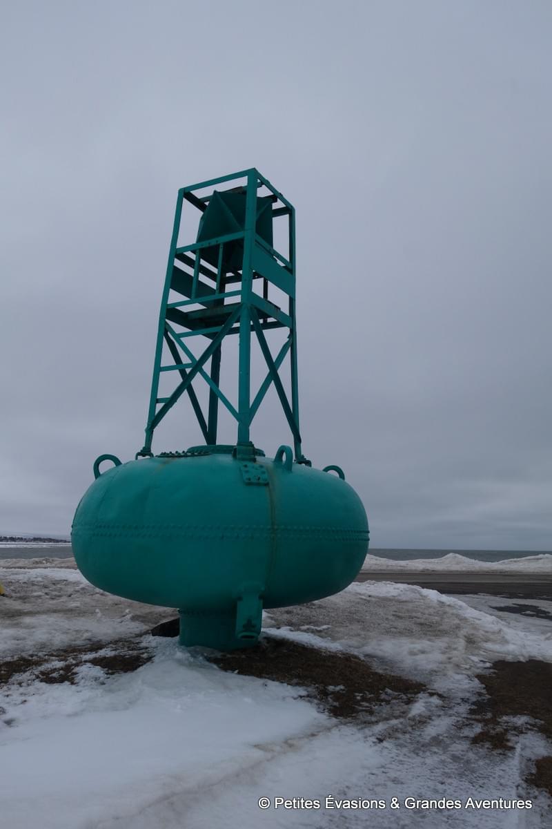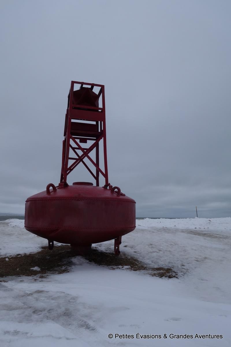 C’est justement la curiosité de voir ce site maritime qui nous a poussé à rejoindre Pointe-au-Père. A notre arrivée sur place, un vent glacial balayait le rivage, le ciel était entièrement gris, lourd. Là, sous les gros nuages, quelques points colorés se détachaient : les bouées de balisage, le sous-marin Onondaga (oui bon, ok, le noir c'est pas vraiment une couleur), le Musée Empress of Ireland –SHMP et le Phare de Pointe-au-Père, avec son sommet rouge.