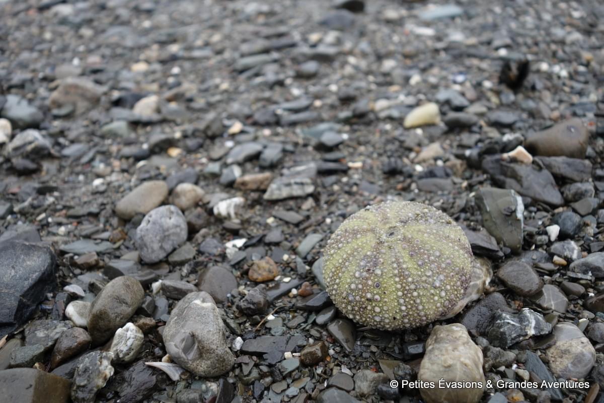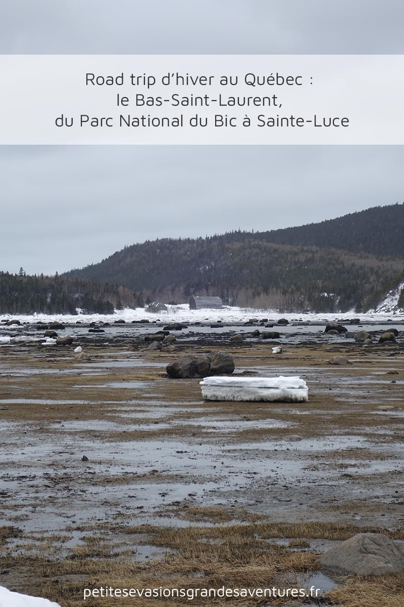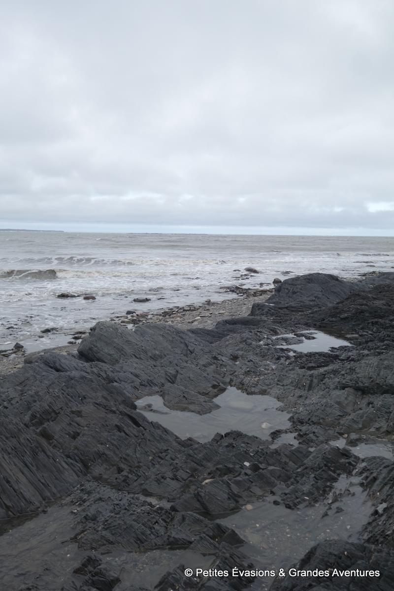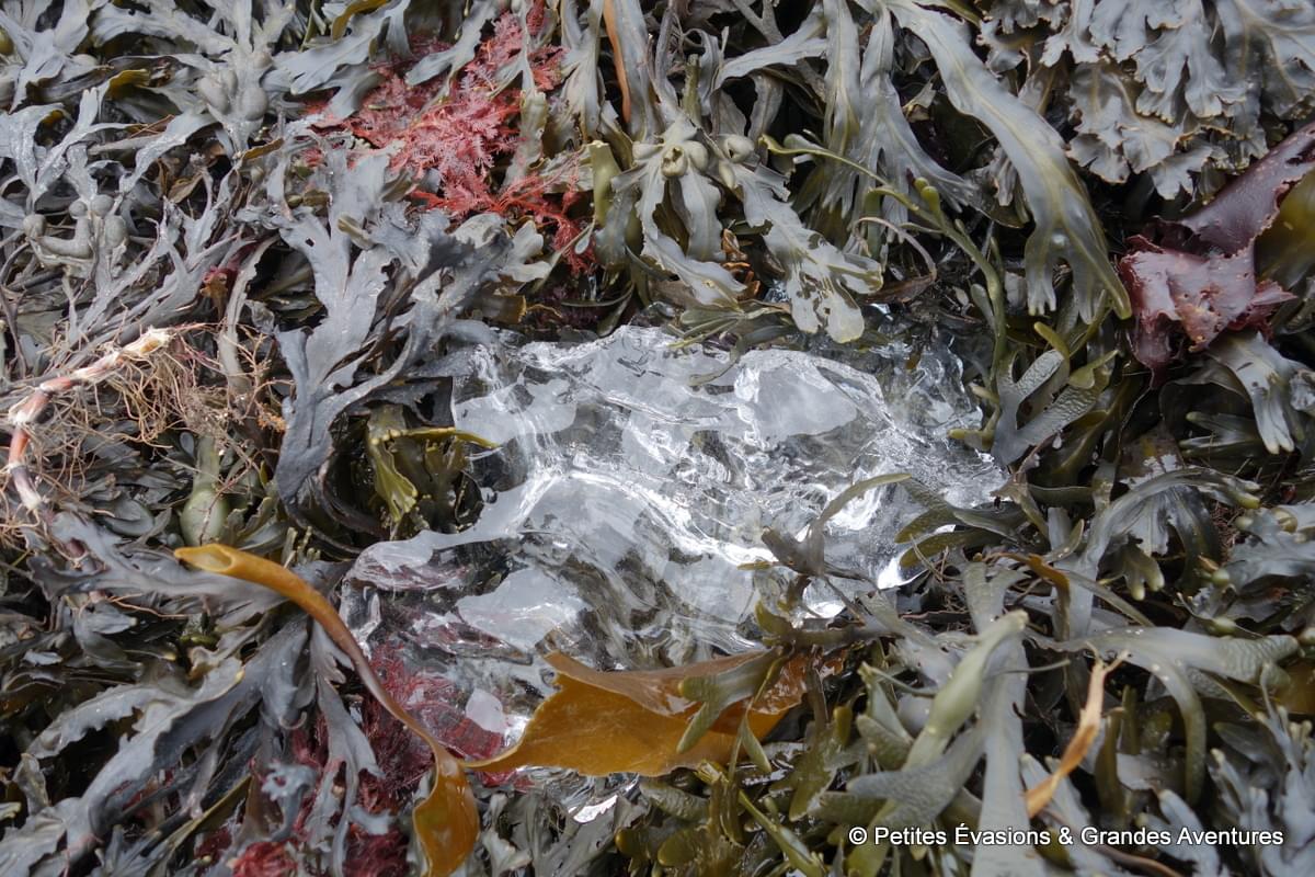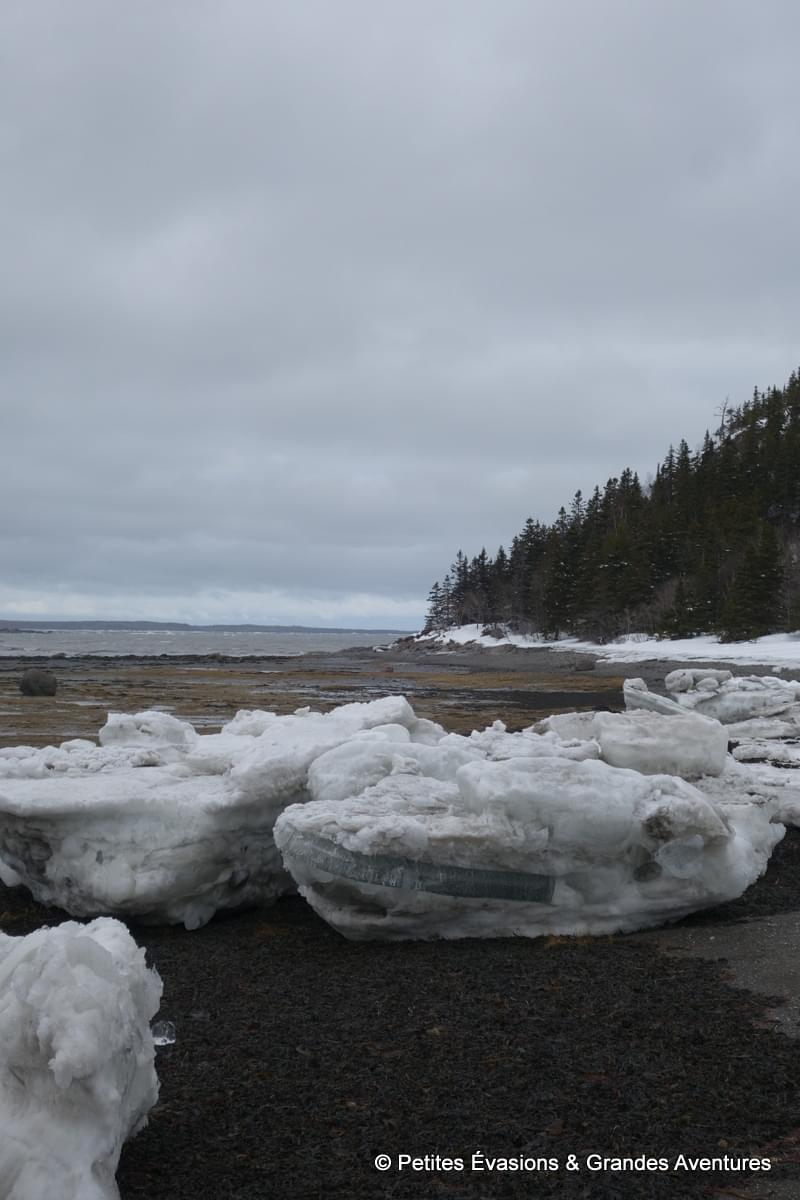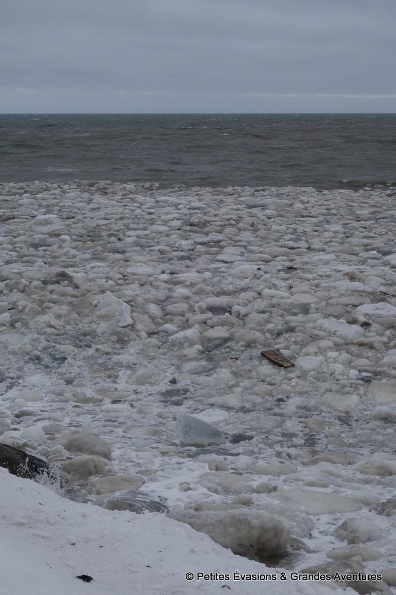 Chaque portion du paysage avait quelque chose de merveilleux, même sous la grisaille. On a donc pris le temps de l’observer dans le détail, de le photographier, d’admirer les veines dans la glace, d’observer les habitants de l’eau salée dévoilés par la marée basse, de s’imaginer vivre dans le petit (vu depuis notre côté du rivage) bâtiment de la Ferme-Rioux (mais en version seuls au monde) …