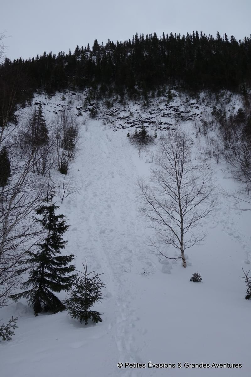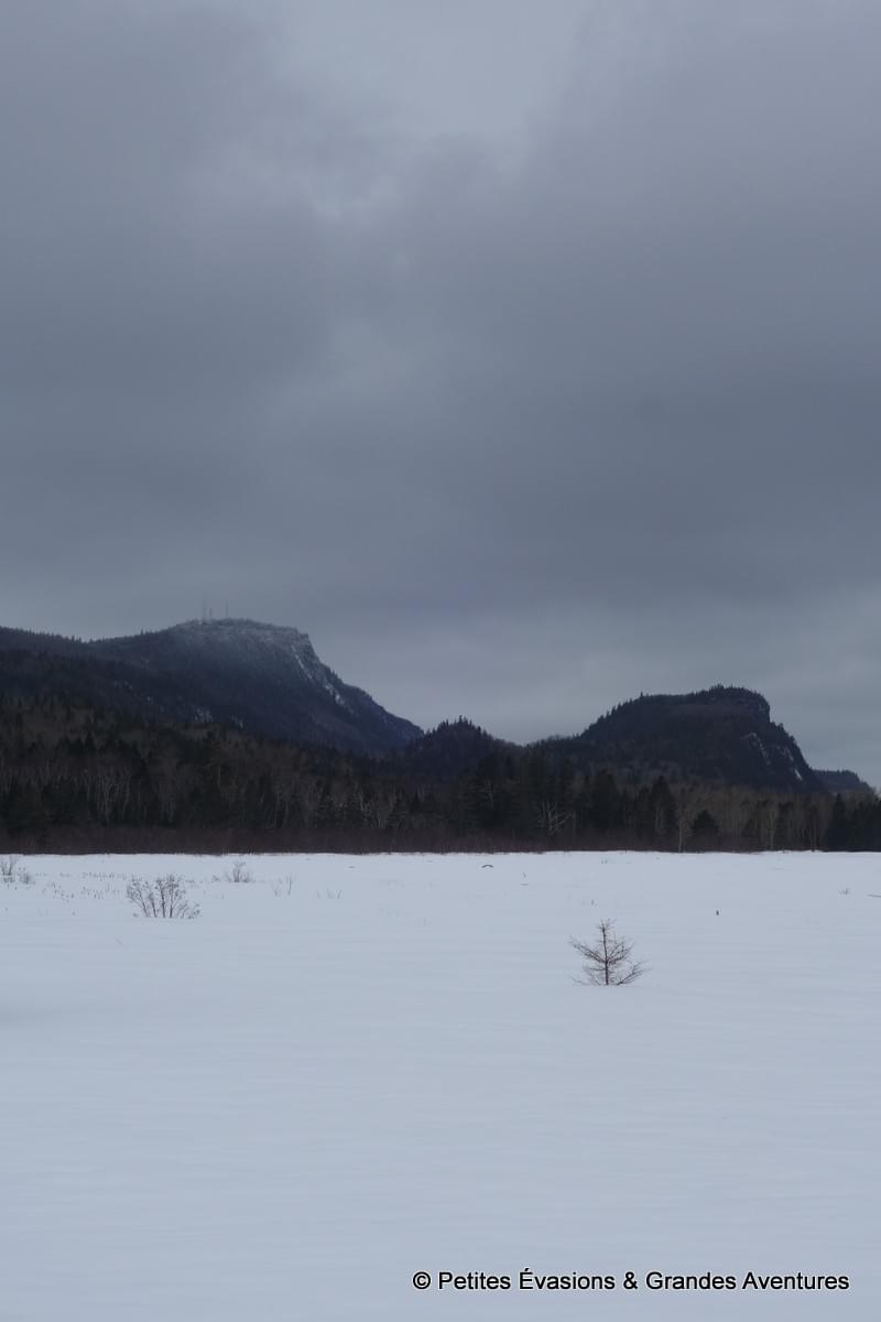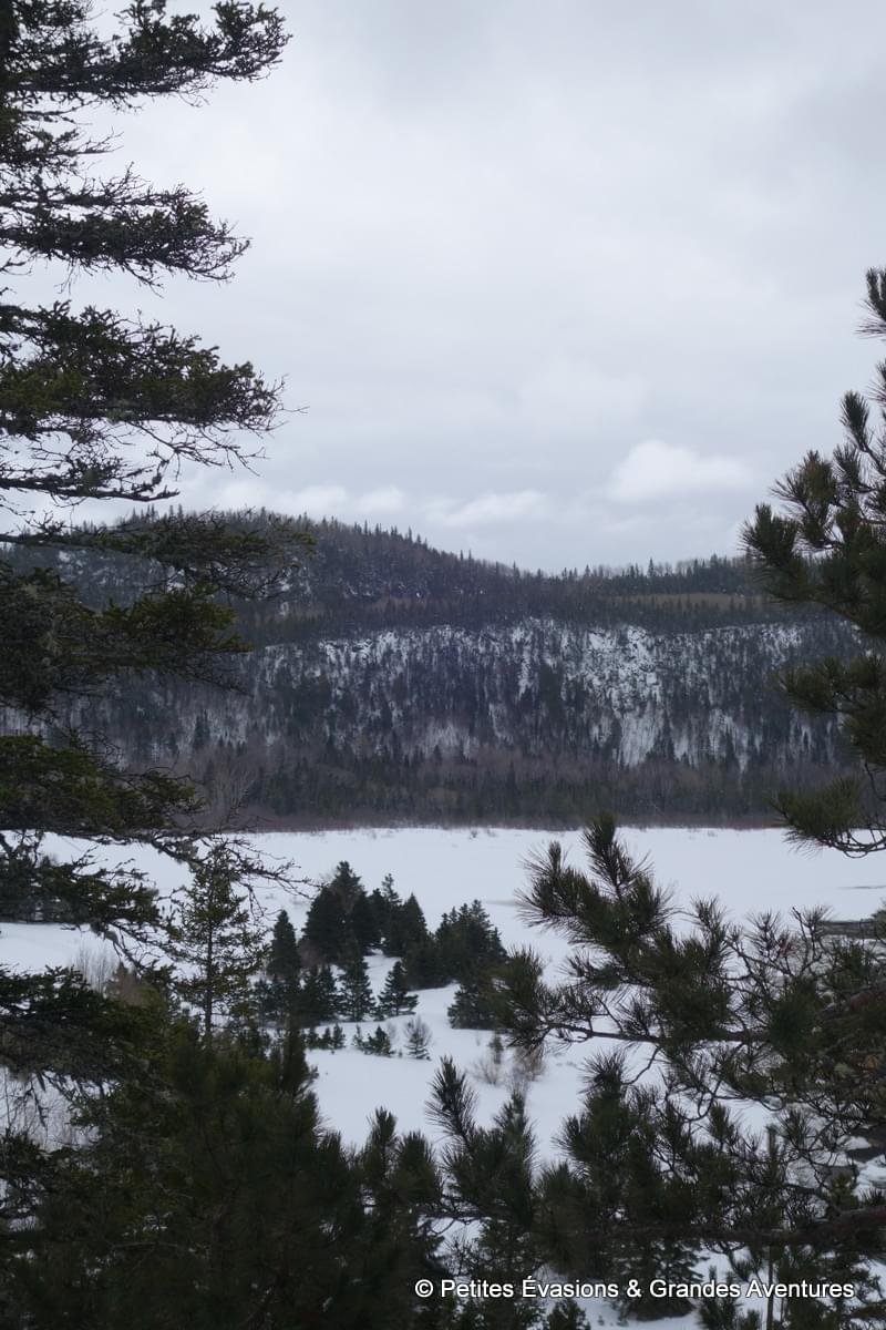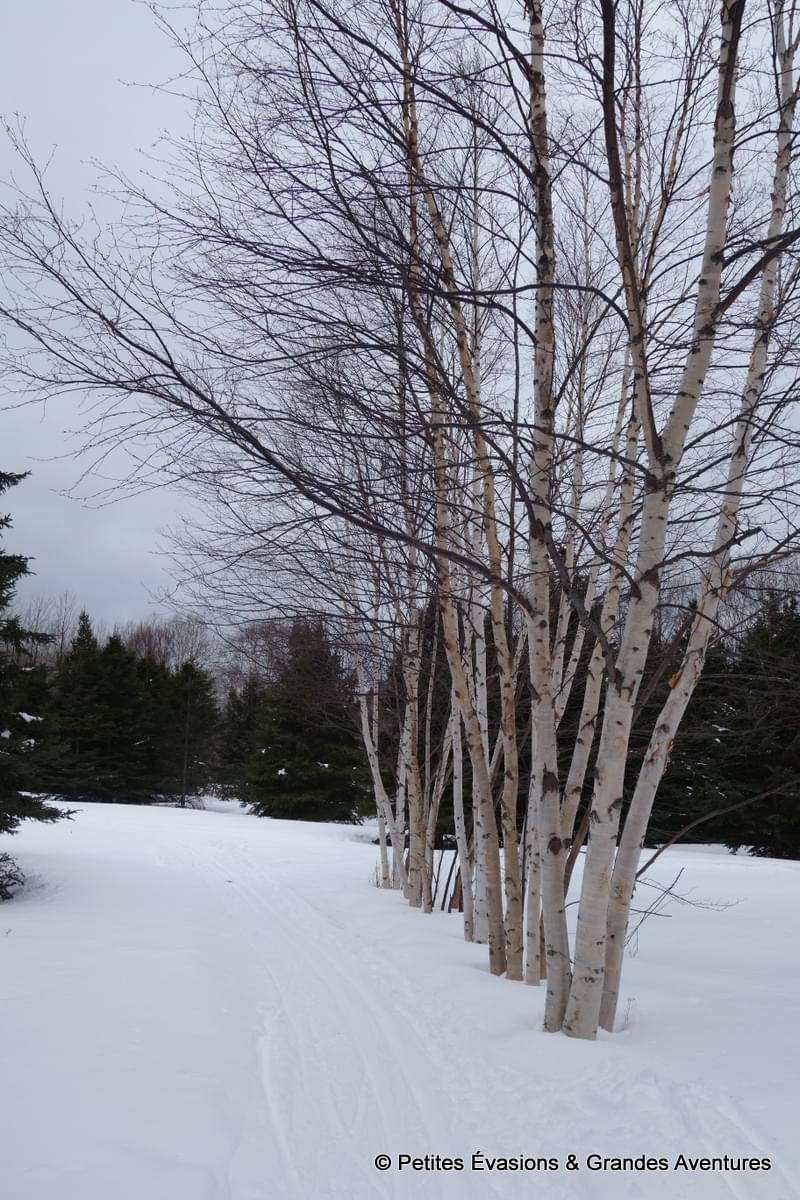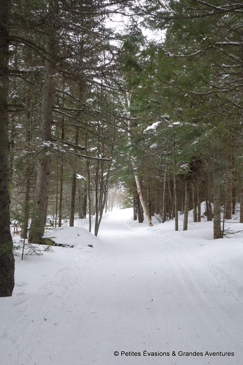 Les jambes alourdies par le ski de fond la veille, nous avons opté pour une simple randonnée pédestre, sur le sentier « Le Portage ». Sous le ciel gris, le paysage prenait au loin des allures de gravures en noir et blanc. Plus près de nous, on observait le vert profond des résineux, quelques touches de couleur d’autres végétaux et puis tout un nuancier de marron sur les troncs des arbres.