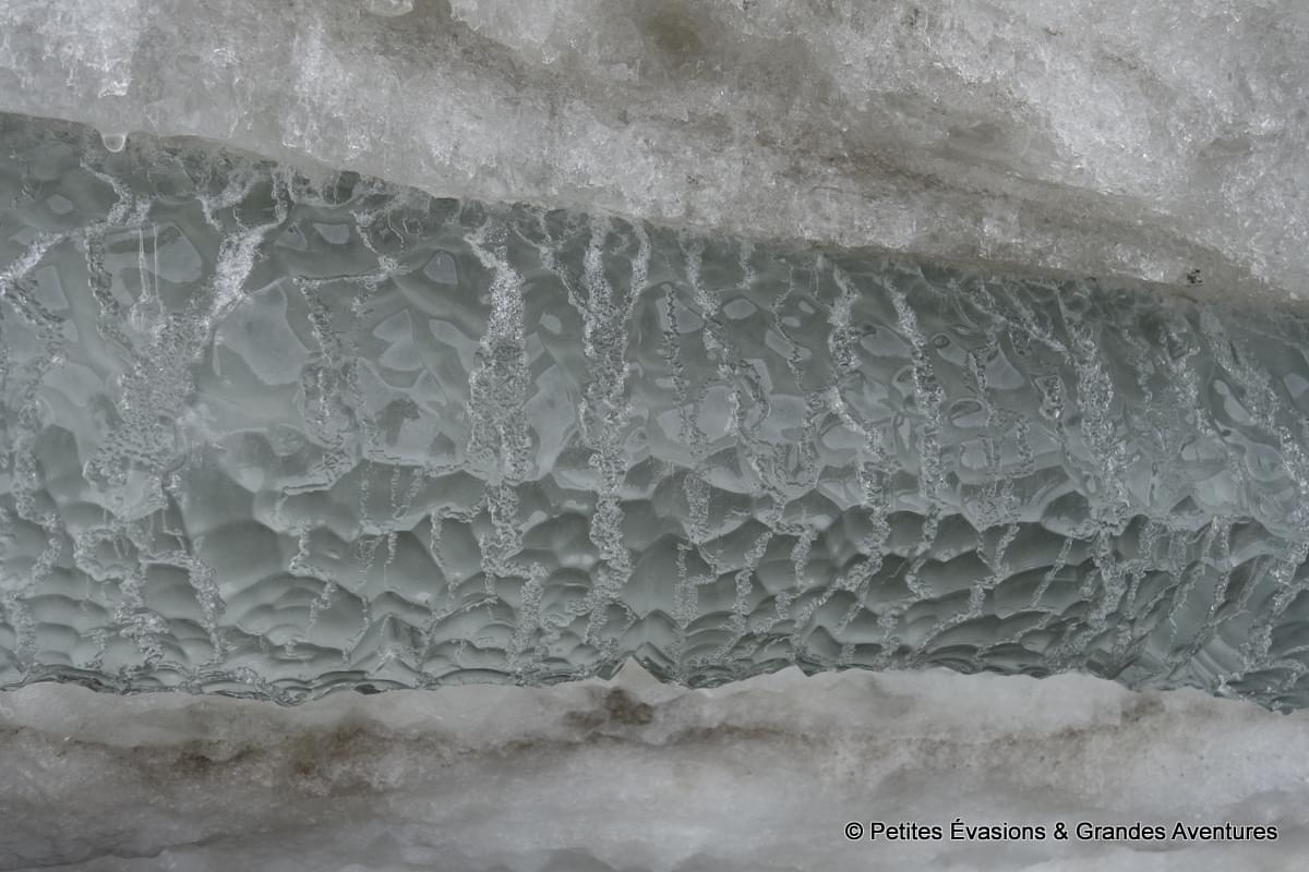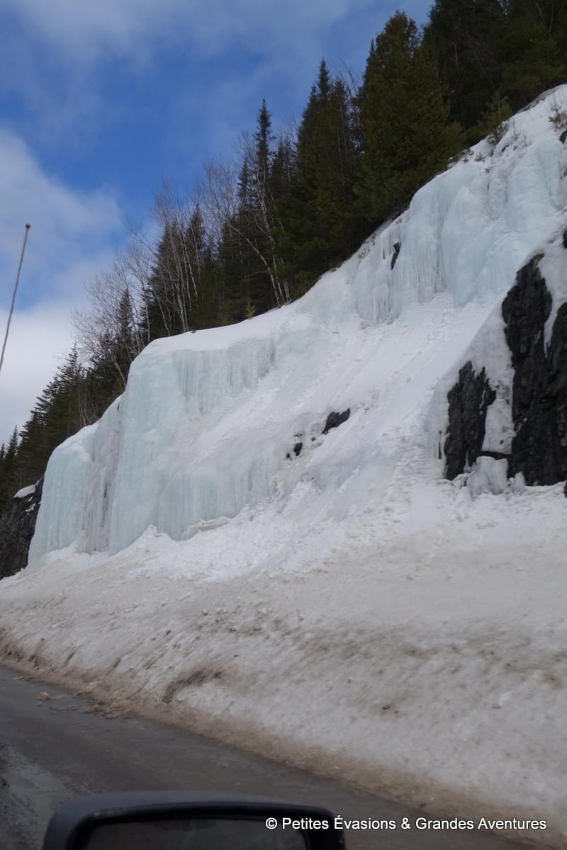 Durant notre premier voyage au Québec et dans les jours précédents de celui-ci, j’avais vu des étendues d’eau entièrement prises dans les glaces, des cascades pétrifiées par le froid, … et voilà que le Québec nous offrait une autre vision de ses eaux hivernales. Du mouvement, du bruit, de la puissance et, en même temps, l'impression d'une certaine fragilité pour cette glace polie par l'eau et les chocs. Un des souvenirs les plus fous de ce séjour.