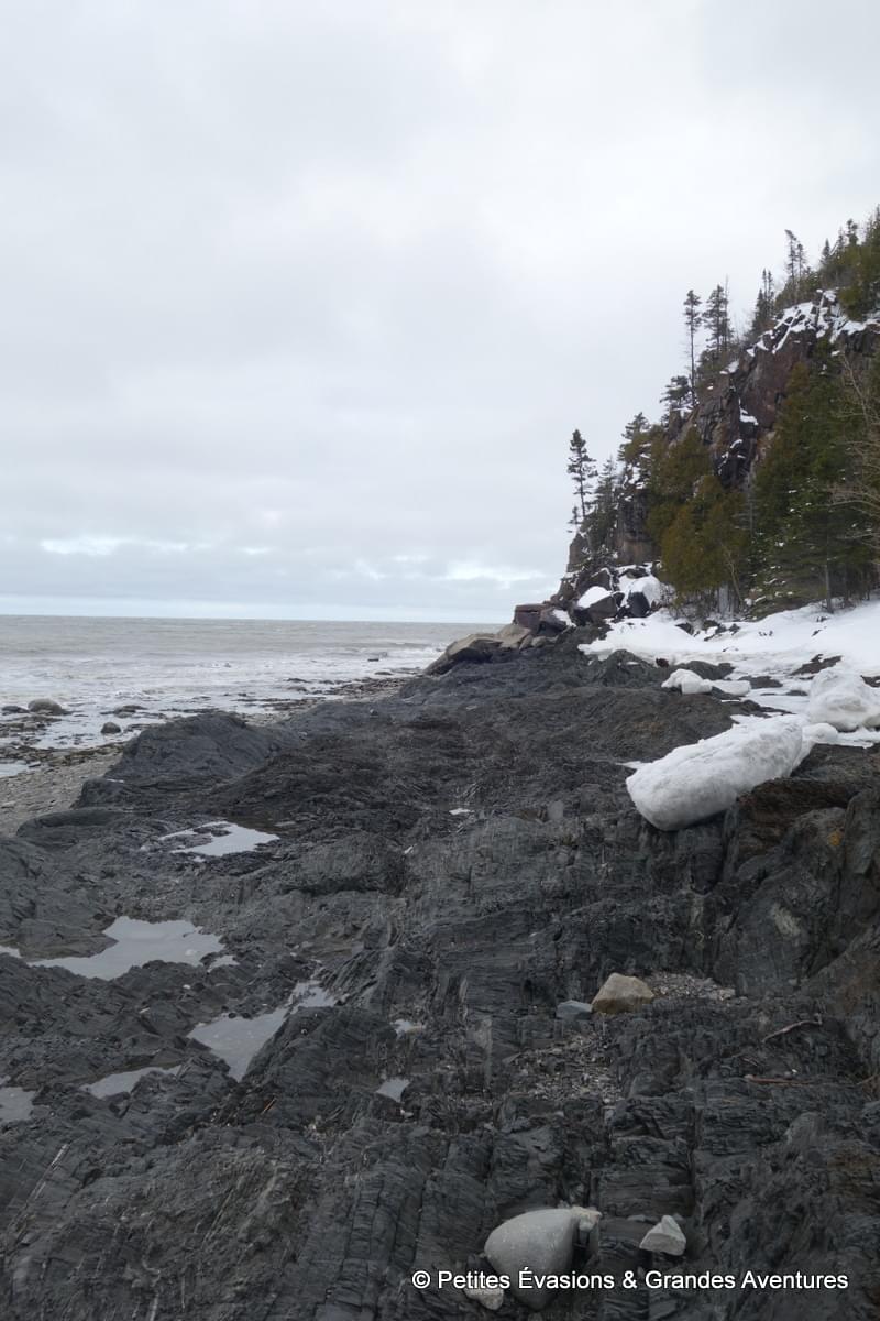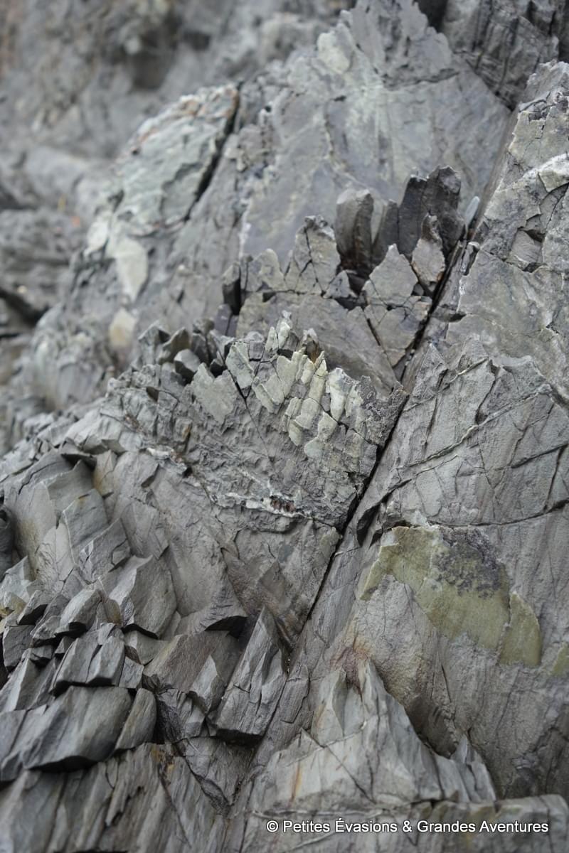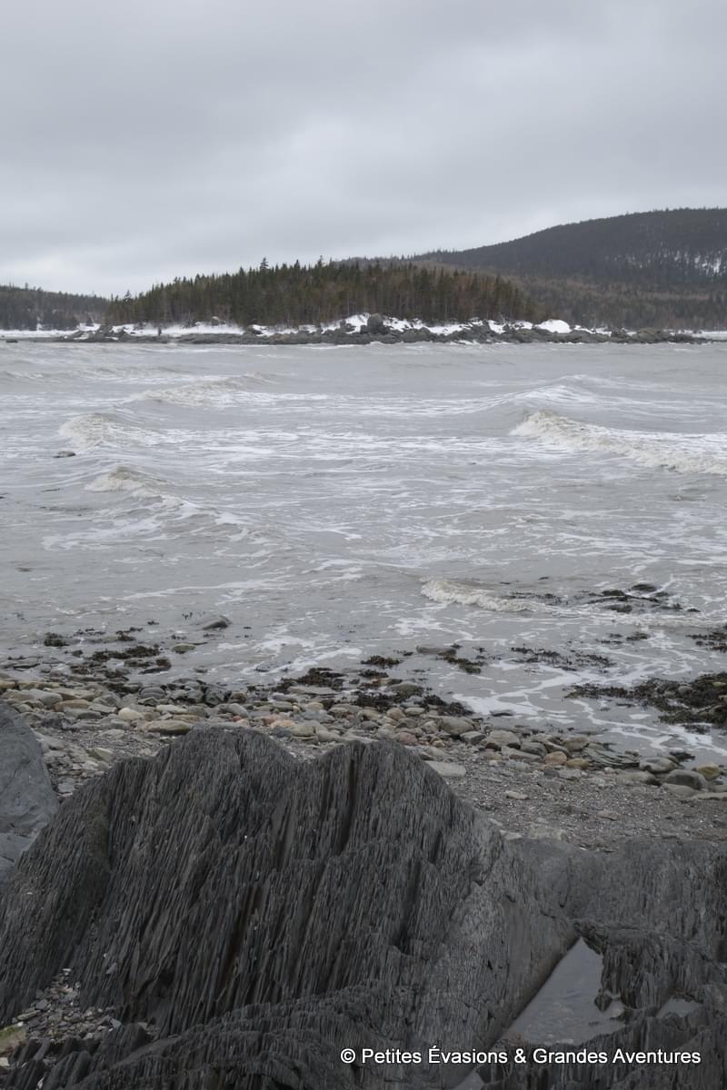 On a tellement pris notre temps que l’eau a peu à peu fait son retour dans la baie, nous donnant une toute autre vision du lieu. On a prolongé un peu ce moment près de l’eau en se rendant près de la Pointe aux Épinettes. Là, on a pu observer dans le détail tout l’impact du passé géologique agité du lieu sur des dizaines de mètres de roches fragmentées, acérées, accidentées.