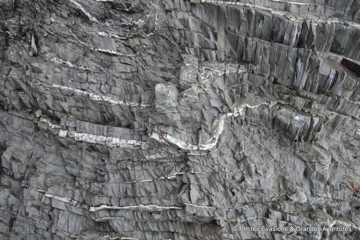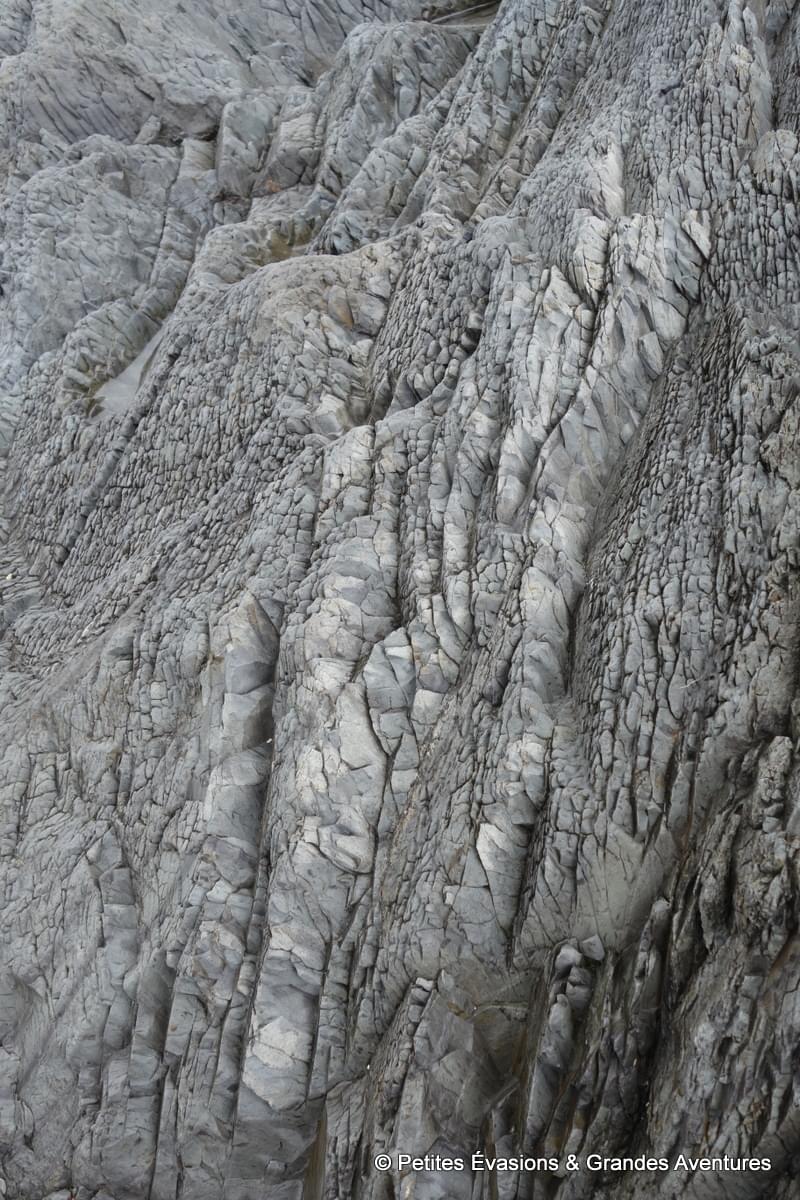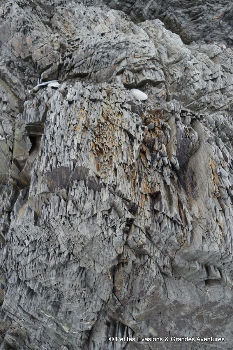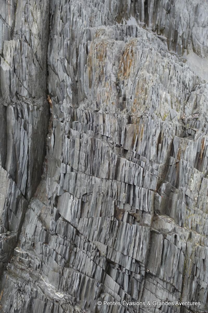 On a tellement pris notre temps que l’eau a peu à peu fait son retour dans la baie, nous donnant une toute autre vision du lieu. On a prolongé un peu ce moment près de l’eau en se rendant près de la Pointe aux Épinettes. Là, on a pu observer dans le détail tout l’impact du passé géologique agité du lieu sur des dizaines de mètres de roches fragmentées, acérées, accidentées.
