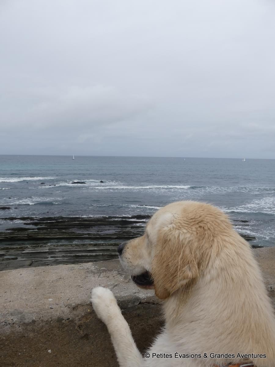 Avant notre séjour, j’avais eu l’occasion de discuter avec une personne (fort sympathique) de l’Office de Tourisme à propos des choses à faire avec un chien. Et c’est donc avec la certitude que l’on n’enfreignait aucune règle qu’on a tous trempé nos pattes dans la mer (anormalement chaude) de la Plage du Centre en profitant de la vue incroyable sur les alentours.