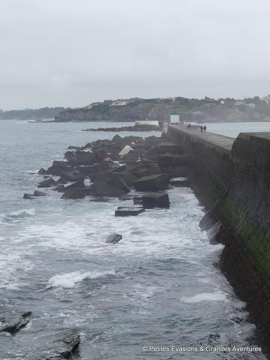 On a fini par arriver à notre objectif et on s'en est pris plein les mirettes. Malgré la grisaille, la vue sur les alentours était magnifique. A gauche, les prémisses de la Corniche basque et au loin l'Espagne et Hondarribia ; à droite, le Phare-Digue de Socoa, la Digue de l'Artha et au-delà la Digue de Sainte-Barbe et la côte de Saint-Jean-de-Luz. Derrière nous, Saint-Jean-de-Luz et Ciboure. Et face à nous, la mer, à perte de vue.