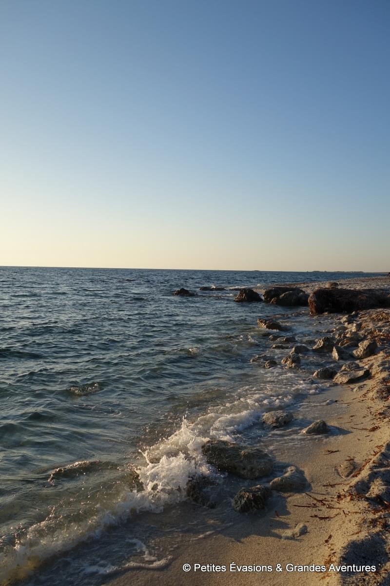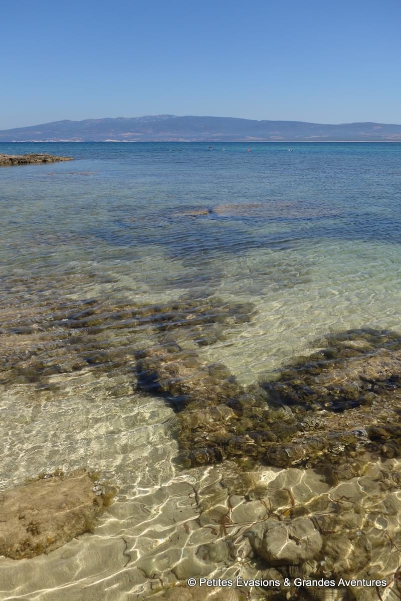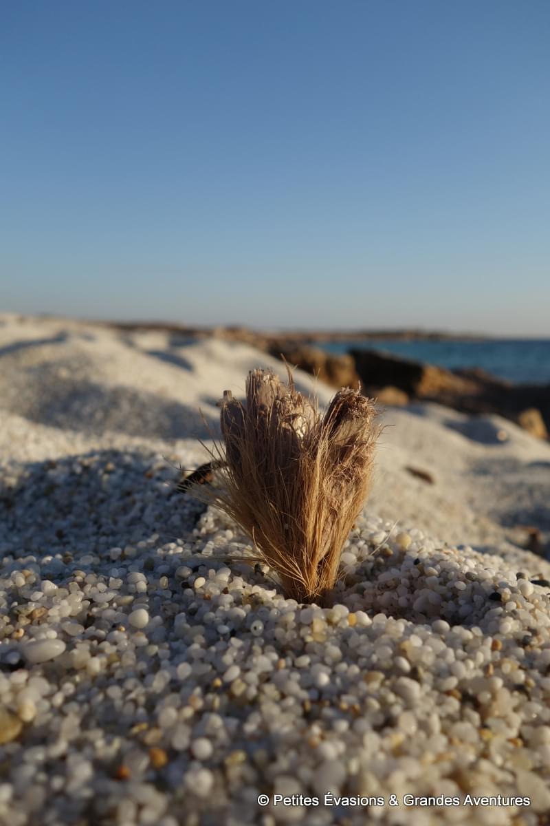 De retour dans notre lieu de villégiature, on s’est bien vite équipés de notre tenue de baigneurs pour rejoindre la plage. À 5 minutes à pied donc, le bonheur. Et, là, on a expérimenté pour la première fois, la baignade parmi les posidonies. Rien d’insurmontable, je vous (r)assure. Juste de longues tiges qui chatouillent les jambes dans l’eau et un coussin moelleux sur la plage !